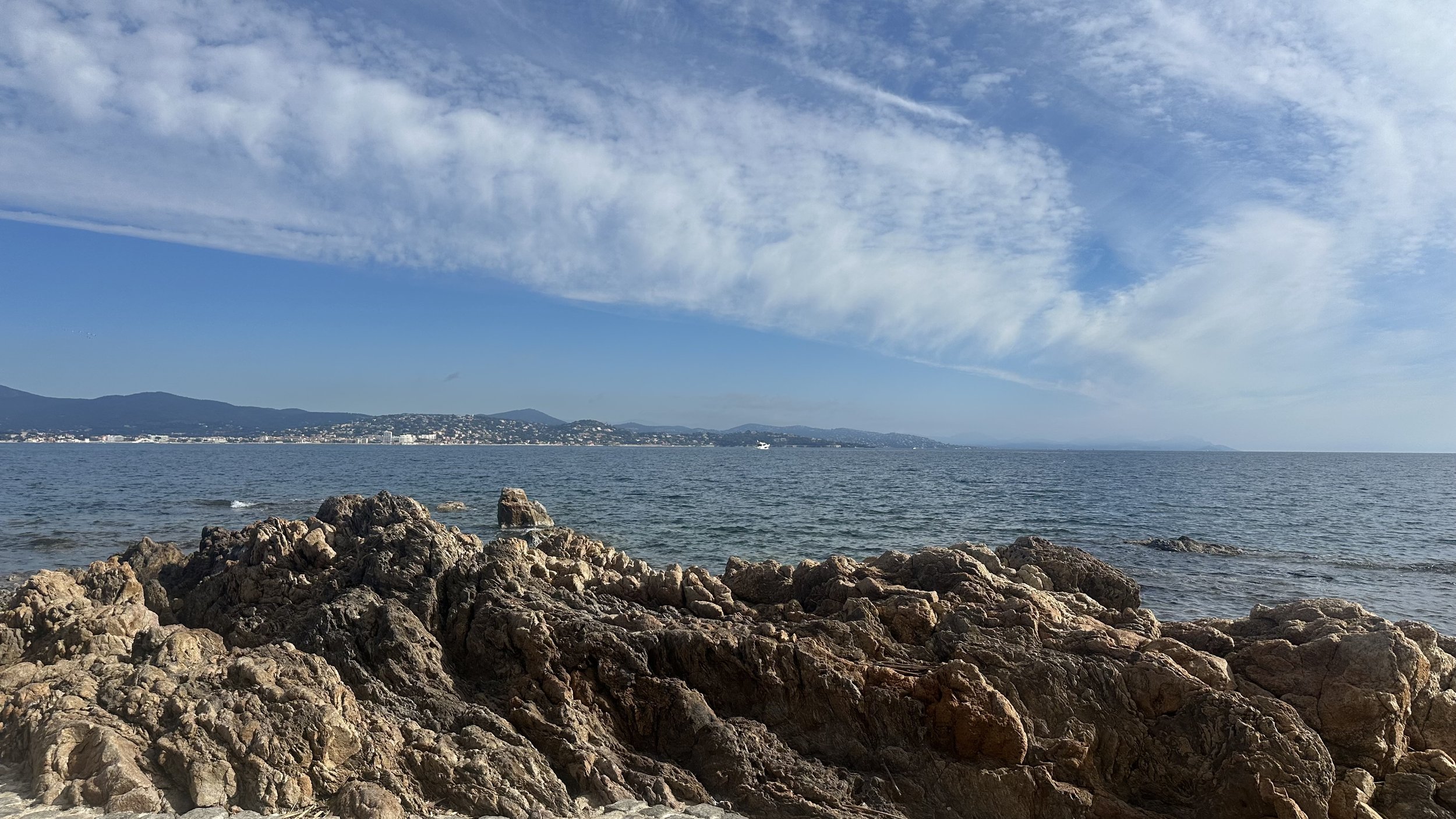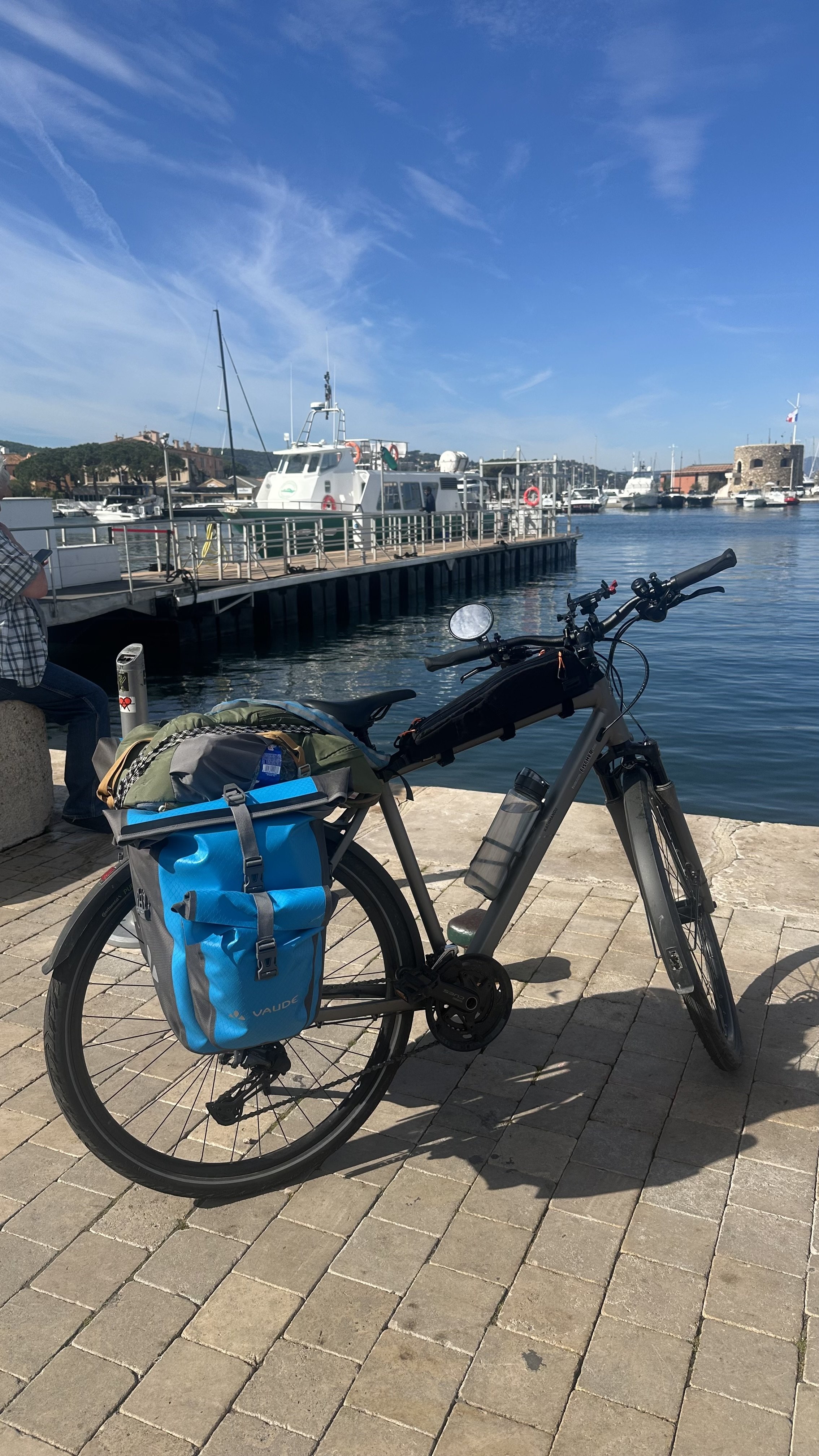 Heute führte mich meine Strecke eine Stunde lang der Küste entlang bis nach Saint Maxime. Von dort führt eine Personenfähre direkt in den Hafen von Saint Tropez, in der Nebensaison kann man gut auch mit dem Velo an Bord. Das ist definitiv die gescheiteste Annäherung an Saint Tropez, der Normalfall ist eine Anfahrt auf der Küstenstrasse mit dem berühmten Stau, dann findet man mit Glück ein Parkplatz weit vor dem Dorf und kämpft sich dann zu Fuss bis zum Hafen durch. Ich hab’s jetzt gesehen aber eine Empfehlung dafür würde ich nicht machen. Da habe ich unterwegs viel schönere Städtchen und Fischerhäfen gesehen. Aber viele Südfrankreichtouristen wollen dahin wo mal Brigitte Bardot und Belmondo gebadet haben oder wo Funès seinen Film gedreht hat.